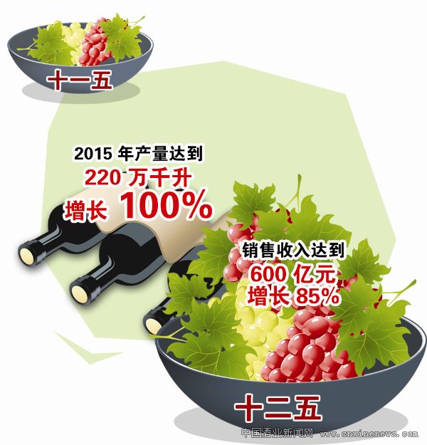 到2015年,葡萄酒产量预计将达到220万千升,比“十一五”末增长100%,年均递增15%;销售收入达到600亿元,比“十一五”末增长85%,年均递增13%;利税120亿元,比“十一五”末增长88%,年均递增13%。