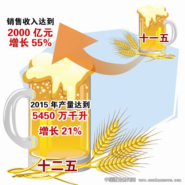 到2015年,啤酒产量预计达到5450万千升,比“十一五”末增长21%,年均递增4%;销售收入达到2000亿元,比“十一五”末增长55%,年均递增9%;利税400亿元,比“十一五”末增长50%,年均递增8.4%。