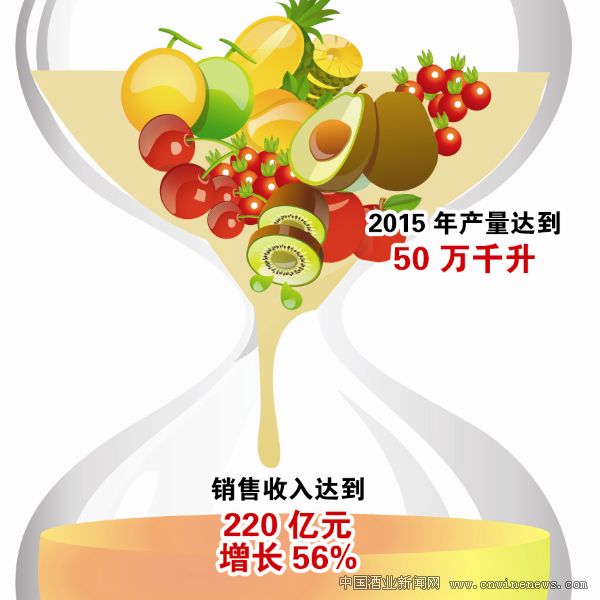 到2015年,果露酒产量预计将达到50万千升左右;销售收入达220亿元,比“十一五”末增长56%,年均递增9.3%;利税40亿元,比“十一五”末增长74%,年均递增12%。