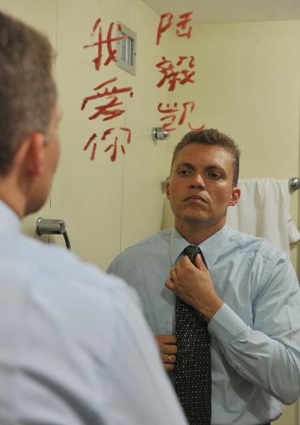 Luiz Carlos wears ties with Chinese characters in the mirror reading "I love you" and his Chinese name "Lu Yi Kai" are seen at his home in Rio de Janeiro, Brazil, April 27, 2011. Luiz Carlos is a teacher of the Federal University of Fluminense in Rio de Janeiro. Luiz started to learn Chinese 3 years ago. Now he not only can speak Chinese, but also can use Chinese brush pen to write. After his visit to China in 2010, Luiz got more and more interested in Chinese learning, even introducing his son Luti to learn Chinese. Luti started to learn Chinese in the beginning of this month. Influenced by his farther Luiz Carlos, Luti is attracted by learning Chinese too. Although he just learned Chinese for only one month, Luti can write some simple characters, and sometimes, he likes using the brush pen bought by his farther to imitate his father's work.(Xinhua/Song Weiwei)