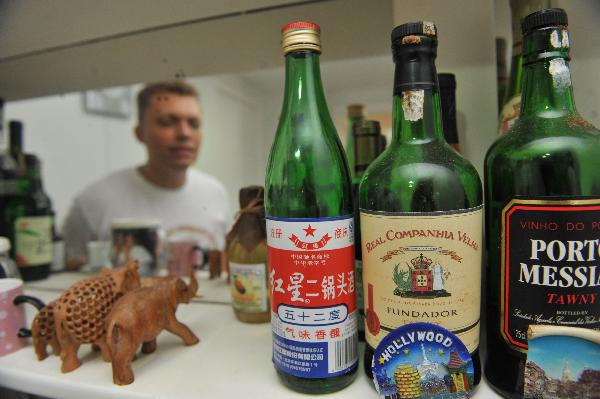 A bottle of Chinese liquor Erguotou(L) is placed on the shelf at Luiz's kitchen in Rio de Janeiro, Brazil, April 27, 2011. Luiz Carlos is a teacher of the Federal University of Fluminense in Rio de Janeiro. Luiz started to learn Chinese 3 years ago. Now he not only can speak Chinese, but also can use Chinese brush pen to write. After his visit to China in 2010, Luiz got more and more interested in Chinese learning, even introducing his son Luti to learn Chinese. Luti started to learn Chinese in the beginning of this month. Influenced by his farther Luiz Carlos, Luti is attracted by learning Chinese too. Although he just learned Chinese for only one month, Luti can write some simple characters, and sometimes, he likes using the brush pen bought by his farther to imitate his father's work. (Xinhua/Song Weiwei)