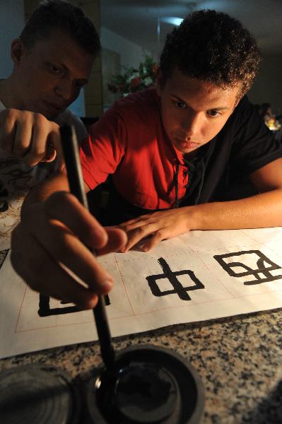 Luiz Carlos helps his son Luti use the Chinese brush pen to write at his home in Rio de Janeiro, Brazil, April 27, 2011. Luiz Carlos is a teacher of the Federal University of Fluminense in Rio de Janeiro. Luiz started to learn Chinese 3 years ago. Now he not only can speak Chinese, but also can use Chinese brush pen to write. After his visit to China in 2010, Luiz got more and more interested in Chinese learning, even introducing his son Luti to learn Chinese. Luti started to learn Chinese in the beginning of this month. Influenced by his farther Luiz Carlos, Luti is attracted by learning Chinese too. Although he just learned Chinese for only one month, Luti can write some simple characters, and sometimes, he likes using the brush pen bought by his farther to imitate his father's work.(Xinhua/Song Weiwei)