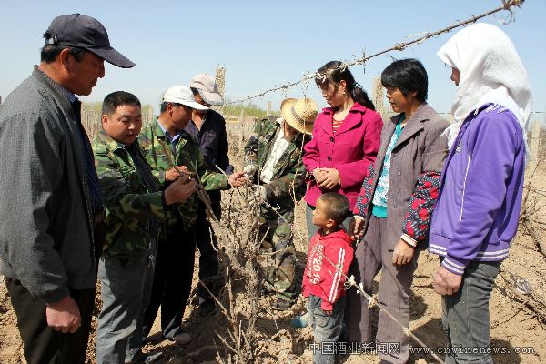 4月25日,在甘肃皇台酒业股份有限公司万亩酿酒葡萄基地上,技术员在为农民工讲解制酒葡萄管理技术。今年,该基地赊给农民工农药、化肥、水电费等生产资料,