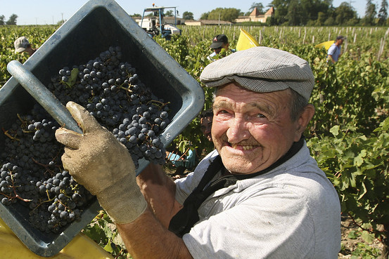 A wine picker with the fruits of his labors during harvest time in a region of France near Bordeaux last September