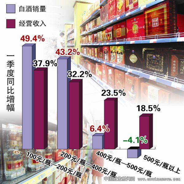 一季度,100元/瓶—200元/瓶及200元/瓶—400元/瓶的白酒销量同比劲升49.4%和43.2%,营收同比增长37.9%和32.2%;同期,400元/瓶—500元/瓶及500元/瓶以上的白酒销售量同比增长6.4%和-4.1%,营收同比增长23.5%和18.5%。