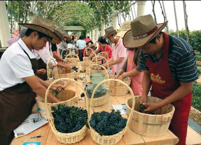 Visitors pick grapes in a local vineyard. Ju Chuanchuang / China Daily