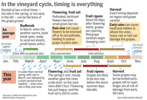 In a twist of fate -- something the wine industry often relies on -- the cool spring had delayed the bloom by up to three weeks, so when the rains came, they did little damage, said Prudy Foxx, a Santa Cruz vineyard consultant and owner of Foxx Viticulture.