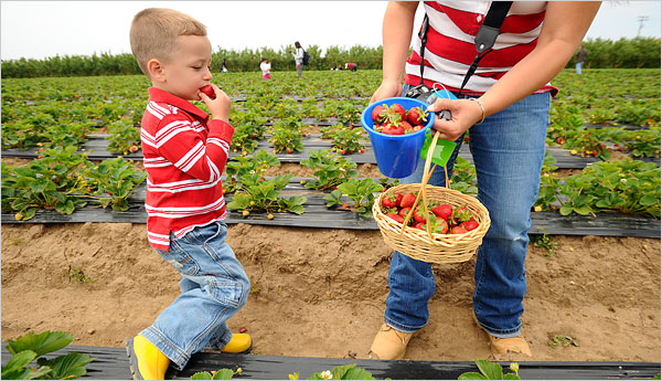 Luca Gaskill, 2, eats a strawberry at Gizdich Ranch in Watsonville, Calif.