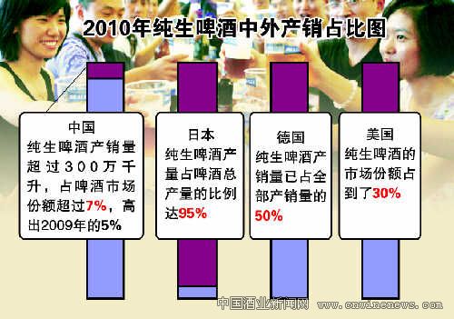 据统计,2010年全国纯生啤酒产销量超过了300万千升,占整个啤酒市场份额超过了7%,高出2009年的5%,相比国外水平仍有较大差距。