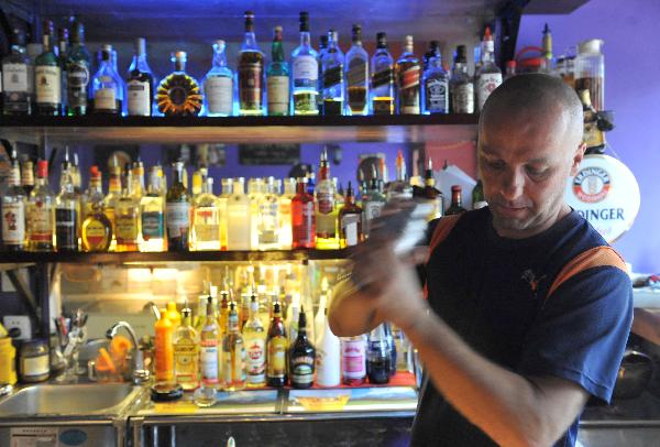 Andy from Austria mixes drinks for customer at his own bar on the West Street in Yangshuo, southwest China's Guangxi Zhuang Autonomous Region, June 9, 2011. In 1984, the first café opened at the West Street in Yangshuo. Its boss was Gao Shuangzhong. From that time, numerous cafes, bars, hotels opened one after another on this 517-meter-long street, which was later nicknamed as the foreigners' street, or the "Global Village". Though Gao Shuangzhong speaks fluent English, he even didn't finish junior high school. It is more surprising that there are three foreign employees working for him in his bar named Bar98. Living and working at the West Street since childhood, Gao has made over an hundred foreign friends here, who invited him to travel in Southeast Asia, Australia, the USA, Germany, etc. "The West Street has the most beautiful landscape in China. Many foreigners love the tranquility and coziness here. Some have stayed for over ten years."Gao said, adding that many of his foreign friends even found their true love in Yangshuo. "Although I am not very knowledgeable, I believe that Chinese and foreigners should live and work harmoniously here, making the West Street more attractive and comfortable. " Gao's fairness and generosity has won his good fame and sincere friendship in these years. The Yangshuo County is renowned for picturesque scenery of Karst peaks and turquoise Lijiang River, while the West Street attracts tourists with ancient and local architectures, various souvenirs, joyous nightlife and exotic styles. It accommodated one million foreign visitors in 2009 and two millions in 2010. With a history of 1400 years, the street is becoming more and more lustrous with an international atmosphere. (Xinhua/Zhou Hua)
