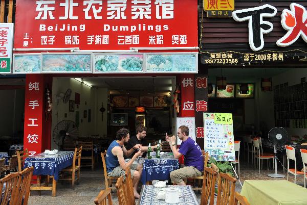 Foreign visitors have meal in a Chinese restaurant on the West Street in Yangshuo, southwest China's Guangxi Zhuang Autonomous Region, June 9, 2011. (Xinhua/Zhou Hua)