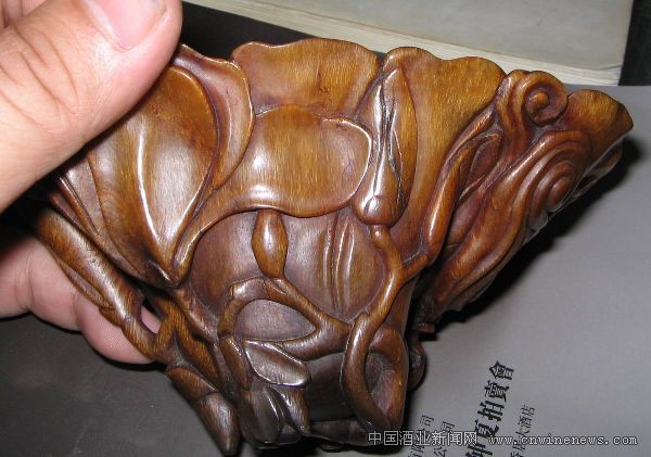 中国的酒文化源远流长,作为中国传统酒具中最为珍贵的一种,犀角杯曾在历史上风光无限。如今,这种历朝历代为帝王将相所喜爱的酒具虽已失去其实用价值,但其收藏价值却在日益高涨。特别是近几年犀角杯屡屡在拍场上创造出天价传奇,使得藏家纷纷追捧。本次万达春拍征集到一件明代犀角杯精品,此杯口径17cm,高9.5cm,底长7cm,为深棕色。器口椭圆形,外壁透雕玉兰花枝,浑重苍黝,古色古香,整个器物形似在花繁叶茂的玉兰枝干上托出一朵盛开的大玉兰花,器口呈椭圆形,雕玉兰花瓣,花瓣自然伸展成杯口,以供饮酒用。透雕玉兰花枝叶覆于杯之外壁,花枝缠绕上趴在杯口。整只犀角杯,从杯口至杯底自然减小,头重脚轻,不能立稳,这也正是犀角杯奥妙之所在。满酒后,由于不能平放在桌上,只能杯不离手,这样更能使饮酒者尽兴。此杯造型庄重典雅,因材施技,静中有动,动中寓情,充分显示了明代制犀艺人高超的技艺,它同北京故宫博物院所藏的一件玉兰花式杯,无论造型还是雕刻技法,均有异曲同工之妙,是一件难得的艺术珍宝,值得着力关注。