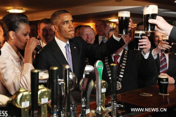 U.S. President Barack Obama (2nd L) and First Lady Michelle Obama (1st L) drink beer together with local residents at a bar in Moneygall, central Ireland's County Offaly, May 23, 2011. U.S. President Barack Obama and First Lady Michelle Obama on Monday afternoon visited his Irish ancestral home in Moneygall. (Xinhua/Maxwell Photography)