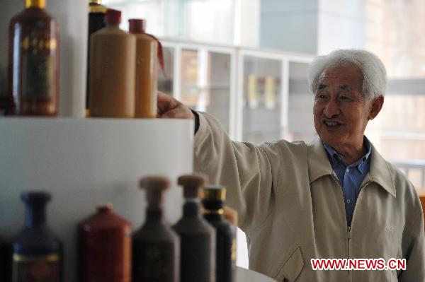 The 76-year-old Hu Shixian (L), a retired worker of Moutai distillery, looks at pictures of her family at her home in Maotai Township of Renhuai, southwest China's Guizhou Province, May 18, 2011. A total of 19 members of Hu's family have worked in the distillery. (Xinhua/Ou Dongqu)