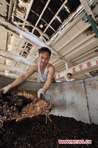 A worker pours ferment materials into at a plant of Moutai Co. Ltd. in Maotai Township of Renhuai, southwest China's Guizhou Province, May 17, 2011. (Xinhua/Ou Dongqu)