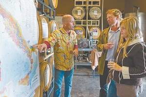 Mark Henry of Montoliva Vineyard and Winery, on Mount Olive Road in Chicago Park, shows Nikki Bruggert and husband Kris Bruggert, of Auburn, the Puglia region in Italy where negroamaro wine has been cultivated for thousands of years. Negoamaro is a new wine for Montoliva, and Henry showcased it during the Sierra Vintners Wine Trail on Saturday and Sunday.