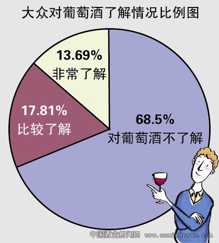 此次调查结果显示:68.5%的人群对葡萄酒不了解,17.81%的人群比较了解,只有13.69%的人群对葡萄酒非常了解;36.27%的人群经常在家里饮用,在西餐厅饮用的占34.93%,酒吧、KTV只占4.02%;45.03%的人群消费葡萄酒是为了配合场所需要,28.77%的人群消费则是注重其具有养生作用,为了个人收藏的只占3.92%;34.72%的消费者选择葡萄酒的首要因素是看品牌,选择看产地的占16.99%,而看重专业推荐的只占2.38%;同等价位(300元/瓶以下)条件下,选择法国出产葡萄酒的占55.93%,优势明显,西班牙、智利出产的分别占16.41%和14.74%,选择中国本土葡萄酒的仅占7.29%。