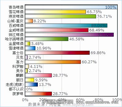 从目前女性饮酒者的群体看,职业女性和经商者占据绝对的比例,这部分消费者对知名品牌有着较高的追求和偏爱。调查数据也显示,青岛、燕京、雪花等品牌,在女性消费者中认知度较高,因此,品牌企业在女士啤酒市场上具有很强的竞争优势,做好女士啤酒的定位和市场推广,知名品牌啤酒将会大有作为。