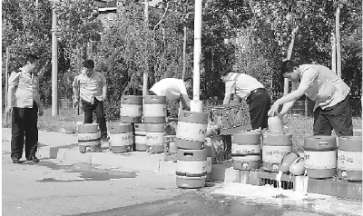 执法人员正在销毁查获的“三无”桶装啤酒和“小企鹅”啤酒。 白相凯 摄