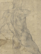 The double-sided sheet of black chalk studies of male nudes probably dates from 1504 when Michelangelo was working on “The Battle of Cascina,” commissioned for a wall opposite Leonardo’s “Battle of Anghiari” in the Palazzo della Signoria, Florence. The fresco commemorating a Florentine victory over Pisan troops in 1364 went unfinished when Michelangelo was called to Rome by Pope Julius II in 1505. Neither painting survives.
