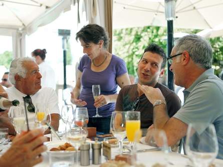 (From right) Gary Saperstein, Seth Schoenfeld, Sheana Davis, and Paul Curreri chat during the Big Gay Brunch & Wine Auction Sunday. The event raised money for Face to Face-Sonoma County AIDS Network and was part of the Gay Wine Weekend 2011, organized by Out in the Vineyard.