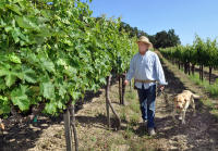 Herb Rowland and his dog Vineyard walks through his Pacheco Ranch Winery on