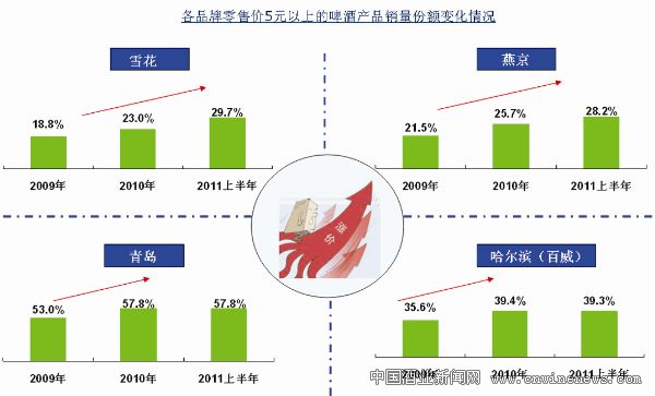 “随着市场集中度的提高,其营销重点已经侧重于品牌拉动和品质驱动。”文章来源中国酒业新闻网李保均逐一分析道,青岛啤酒的价格和利润一直高于行业平均水平,已经形成了较强的中高端竞争力和品牌美誉度,“2009年和2010年,青啤吨酒利润分别达到298元和267元,领先于主要竞争对手。”而雪花啤酒已经明显感受到低价快速占领市场的粗放扩张对于利润率的严重影响,在全国布局和市场份额遥遥领先的基础上,通过“勇闯天涯”等营销手段,逐步向中高端进军,其长期以来的低端形象有所改观。而百威英博用哈尔滨替代雪津作为全国性品牌,主攻中高端市场,同样取得了明显成效,“近两年,哈啤可谓异军突起,从东北区域品牌演变为成长性极强的全国品牌,已经具备了进一步改变市场格局的实力。”