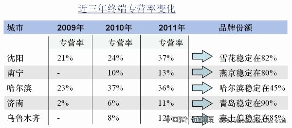 由此可见,中国啤酒行业,尤其是内资品牌,亟需摆脱主观决策、经验经营和恶性竞争,用精确、及时的市场数据作为决策和营销的指导,先因(市场状况)后果(企业决策),赢得竞争。“商业壁垒对于啤酒企业的保护作用已经明显削弱,认识到这一点,更多的中国啤酒企业已经踏上了创新调整的道路。”李保均介绍说,地方性品牌中,金士百啤酒股份有限公司走在了信息化管理的前面。金士百已经能从售点数、市场容量、铺货率、单店份额、市场份额等中发现机会,影响决策,市场占有率稳步上升。