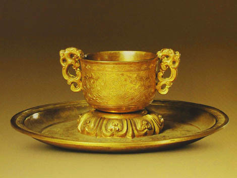 Chinese wine sets Ⅵ:Gold small cup (sacrificial vessel) with two Kui-dragon-shaped ears