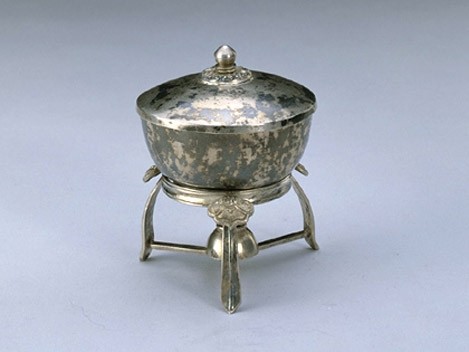 The silver wine heater is similar to a modern-day alcohol heater. It's made up of two parts: the cup with a lid and the stand. The stand is a structure of three legs upholding a round plate, on which liquid fuels like ethyl alcohol can be placed. A round basin-shaped cup with a lid is set on the stand. The cup can hold wine for heating before the wine is served.