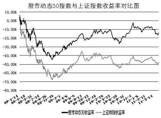 股市动态30指数自2008年1月1日设立以来,下跌13.95%,同期上证指数下跌47.81%。本周股市动态30指数跑输大盘、股票组合跑赢大盘。