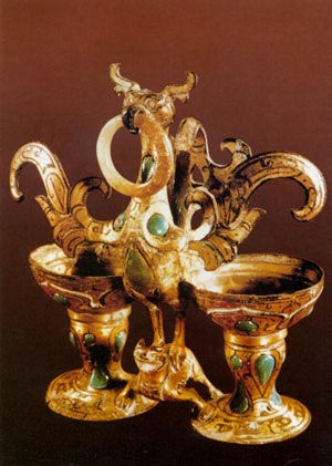 Unearthed in the tomb of Dou Wan, this bronze hejin cup is decorated with a bird that expands its wings and has a jade cup in its mouth and an imaginary beast below its feet. It’s the wedding memento of the prince Liu Sheng and his wife Dou Wan.