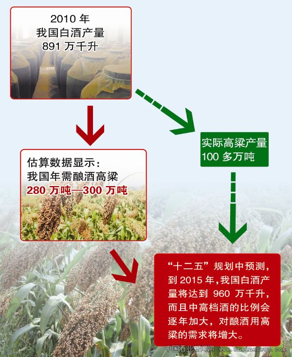 《华夏酒报》记者调查发现,我国现有的高粱产量已经不能满足白酒行业的总体需求,“抢粮”现象已经逐渐显露,这一供需矛盾造成了高粱市场价格紊乱。虽然一些企业已经建立了自己的原料基地,但是现阶段还不能完全满足自身需要,仅五粮液公司每年高粱的需求量就达30万吨。酿酒业有句俗语:“一斤酒五斤粮,二斤四两是高粱”。2010年,我国白酒产量达到了891万千升,有估算数据显示,我国年需酿酒高粱280万吨—300万吨,与实际产量的100多万吨相差甚远。“十二五”规划中预测,到2015年,我国白酒产量将达到960万千升,而且中高档酒的比例会逐年加大,对酿酒用高粱的需求将增大。