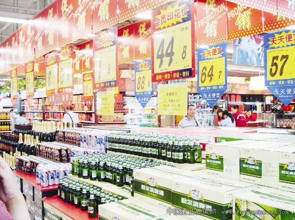 在大润发超市,啤酒和葡萄酒都做了促销堆头,啤酒集中促销比较多,哈尔滨啤酒10度(24瓶装),原价59.9元/箱,现价44.8元/箱;500ml装蓝带啤酒原价4.4元/听,现价3.8元/听;500ml装哈尔滨冰纯啤酒原价4.8元/瓶,现价4.3元/瓶;640ml装蓝带啤酒经典原价5.2元/瓶,现价3.5元/瓶。促销的葡萄酒主要有张裕、威龙、白洋河,750ml装白洋河优级干红原价16.9元/瓶,现价11.2元/瓶;750ml装威龙金樽干红原价25.8元/瓶,现价19.8元/瓶;1500ml装张裕起泡酒原价26.3元/瓶,现价26元/瓶。