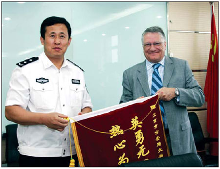 Pernod Ricard representative presents a banner to express appreciation for the Daxing Public Security Bureau's efforts in fighting counterfeits. Provided to China Daily