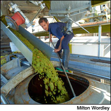 A winery worker helps as Chardonnay grapes tumble into a press at Petaluma wines.