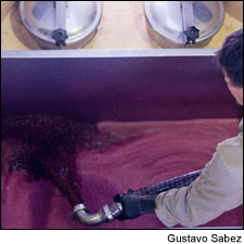 A winery worker at Argentina's Manos Negras fills a tank with fresh grape must.
