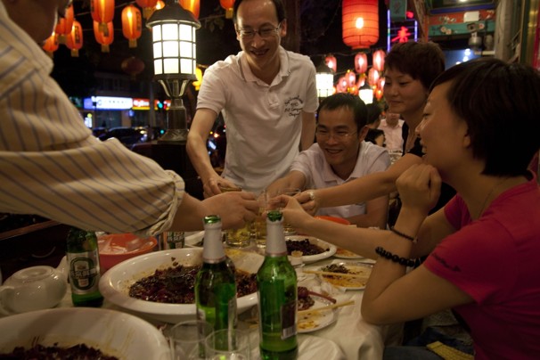 William Wan/ THE WASHINGTON POST - Salesman Feng Bolin, 40, standing at center, shares a toast with coworkers at a Beijing restaurant. To do business in China, drinking is a must, he said. On this night, he rode his bicycle.