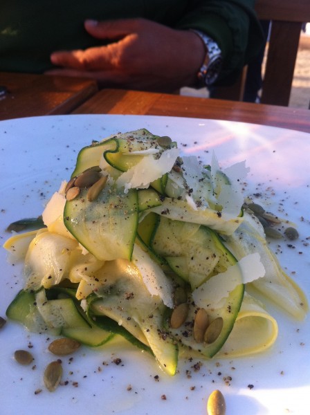 When I want to show off Sausalito to friends, I now have a place to go for waterside views, pizza and some first-rate salads. Bar Bocce is the latest concept from Buckeye Roadhouse’s Robert Price and the Real Restaurants folks. I was particularly taken by this salad of squash ribbons and shavings of cheese in a lemony dressing with toasted pumpkin seeds.