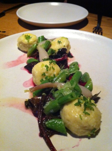 Everytime I go to Bar Agricole I marvel at the seamless integration of food and cocktails. It’s one of the few places where I look forward equally to both. Recently chef Brandon Jew prepared sheep’s milk ricotta gnudi, which are soft dumplings some describe as ravioli without the pasta. Here they are served with green garlic, chard and snap peas.