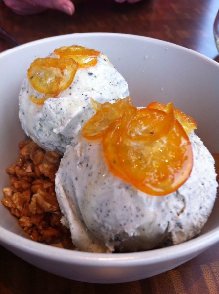 I love just about everything at Nojo (see my review in The Chronicle’s Food & Wine section on Sunday), but this dessert has captivated me and everyone I’ve brought along to taste it. It’s black sesame and white miso ice cream from Humphry Slocombe; they’re topped with rings of candied kumquats and scooped onto a base of Thunder Crackers — caramelized puffed rice clusters with peanuts.