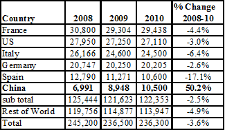 Data on wine consumption are presented in Table 2. Overall, OIV estimates that global wine consumption fell 3.6% from 2008 to 2010, with at least part of this resulting from the global recession. In the top six wine-consuming countries, the largest decline occurred in Spain (-17.1%). Recession? China was again “the elephant in the room”, with wine consumption growing by 50%!