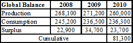 OIV estimates global production and consumption of wine annually and arrives at a figure for an overall global balance. Their latest estimate is presented in Table 3. It appears that the world has been producing surpluses since 2008. The 3-year surpluses totaling 81,300 thl (34% of annual consumption) is putting downward pressure on prices.