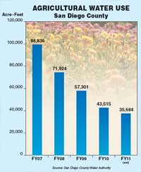 The San Diego County Water Authority attributes the decline in agricultural water use in the county to drought, followed by unusually cool, wet weather. The agency also cites a 30 percent cut in agricultural water use required of participants in a water-discount program and notes that rising water rates have led to a continuing decrease in the number of agricultural water customers.