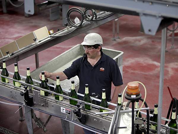 Steve Bloom, a bottling supervisor at Constellation Brands, checks the labels on a run of Manischewitz Cream White Concord wine at the company’s new bottling facility in Canandaigua. / ANNETTE LEIN/staff photographer
