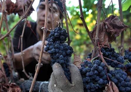 A vineyard worker removes shriveled pinot noir grapes at Cattalini Vineyards near Forestville on Sept. 28, 2010. The vineyard suffered a 30% loss due to heat waves.