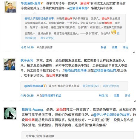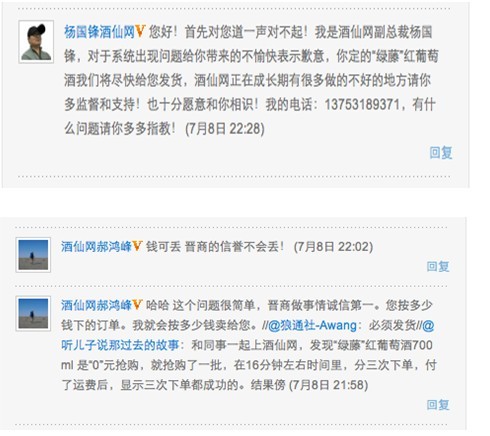 本为“抢购”成功而兴奋不已的这位网友接到这样的电话自然是大失所望,并且对酒仙网的“出尔反尔”大为不满,于是在微博上给酒仙网的多位领导反应此事。酒仙网董事副总裁@杨国峰酒仙网 和酒仙网董事长@酒仙网郝鸿峰 均在第一时间给予了回复。酒仙网副总裁杨国峰发微博针对网站系统错误问题向广大网友致歉,表示会按“0”元价格给网友发货,并留下了自己的手机联系方式;酒仙网董事长郝鸿峰在微博回复称,“钱可丢,晋商信誉不可失”,也表示会按“0”元价格为网友发货。