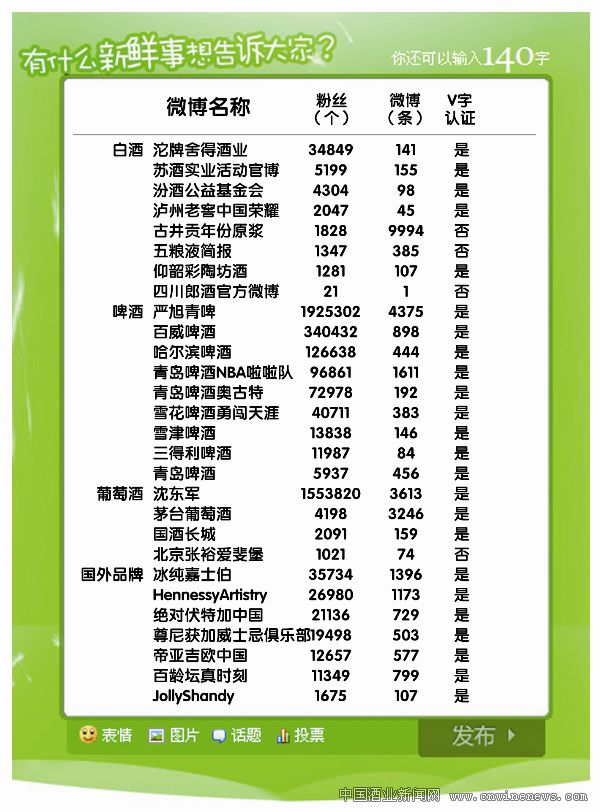 目前,不少的酿酒企业或个人开设了微博,其中既有生产企业,又有流通企业,既有企业官方微博,又有企业员工微博,此外,还有酒类爱好者的微博,涵盖范围十分广泛。在新浪微博中简单检索可以发现,从青岛啤酒、雪花啤酒、百威啤酒、燕京啤酒四大啤酒巨头到泸州老窖、古井贡等白酒企业,再到茅台葡萄酒、VinoSpirit法国葡萄酒等国内外葡萄酒企业,还有尊尼获加、威士忌等洋酒品牌都开设了官方微博,提高了企业在微博平台上的曝光率。据统计,目前仅新浪微博一家共有包含酒类的微博35380082条。