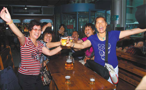 Ganbei! Some happy guzzlers toast their visit to Tsingtao with a few jugs of the signature drink. Provided to China Daily