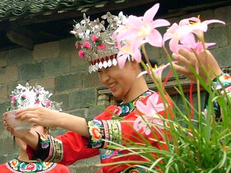 Guest-greeting drinking is a custom unique to the Miao ethnic people. When guests come to a Miao village in the mountain, chances are they’ll be greeted with several wine blockades on the bumpy paths in the field. The road-blocking wine accompanied by songs may be three or five rounds, with twelve rounds at most. The last blockade is at the gate of the village, where there’s usually a small and exquisite wooden tower, with a pair of ox horn wine cups hanging in the middle of entrance of the tower. Holding ox horn wine cups with both hands, two beautifully-dressed village girls and the elderly clan head offer wine to the guests in turn. The guests, however, should remember not to take the cup with their hands, otherwise, the hosts will let go the cup and the guests are expected to empty the whole cup.